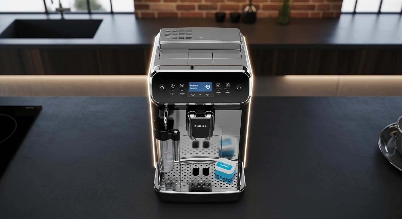 Proces czyszczenia w większości modeli Philips (seria LatteGo, 2200, 3200, 5400) wygląda podobnie. Pamiętaj, aby nigdy nie wrzucać tabletki do zbiornika na wodę – to miejsce przeznaczone wyłącznie dla odkamieniacza. Tabletka musi trafić bezpośrednio do bloku zaparzającego.